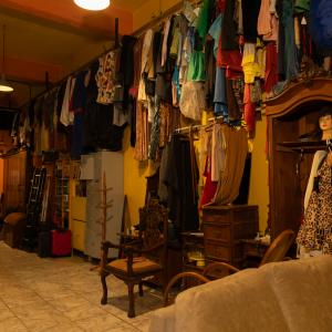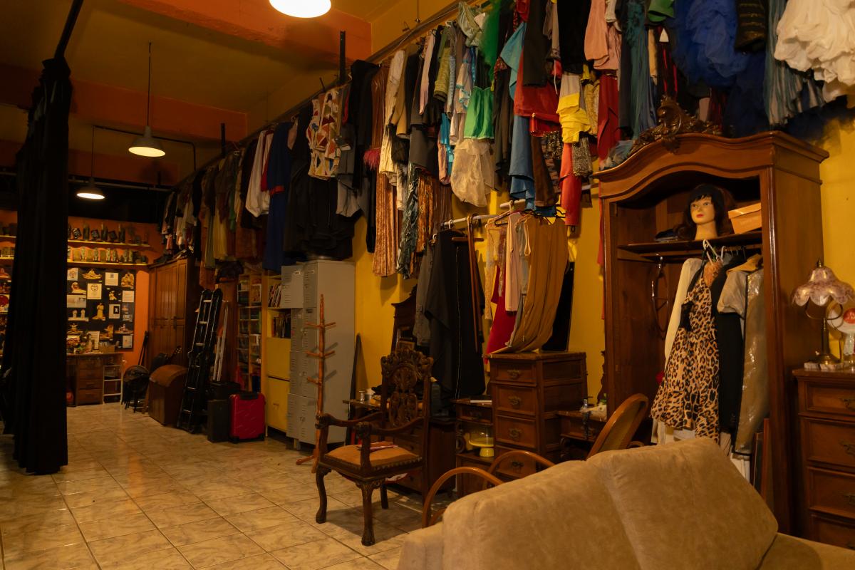 Espaço adaptado, reservado, com espelho e bancada de aproximadamente 3 metros, cadeiras, araras, sofá.