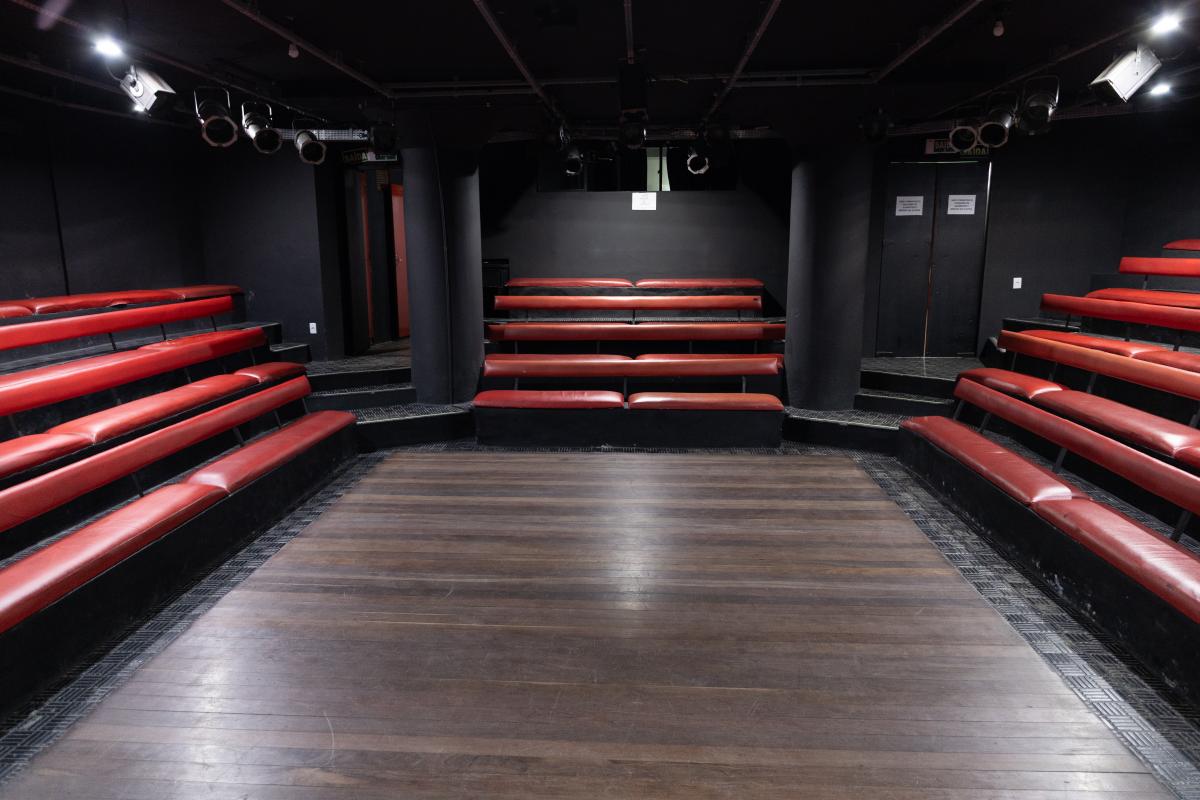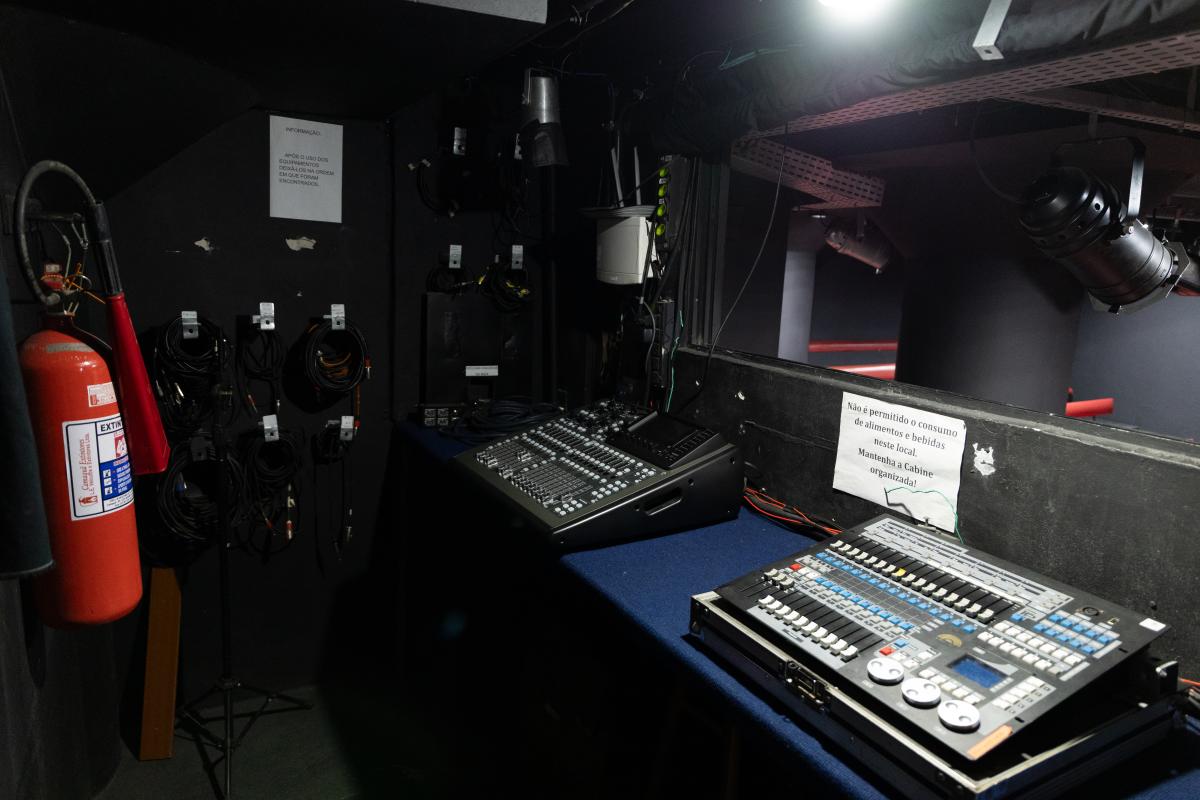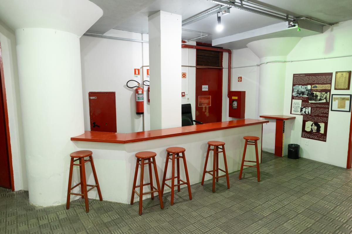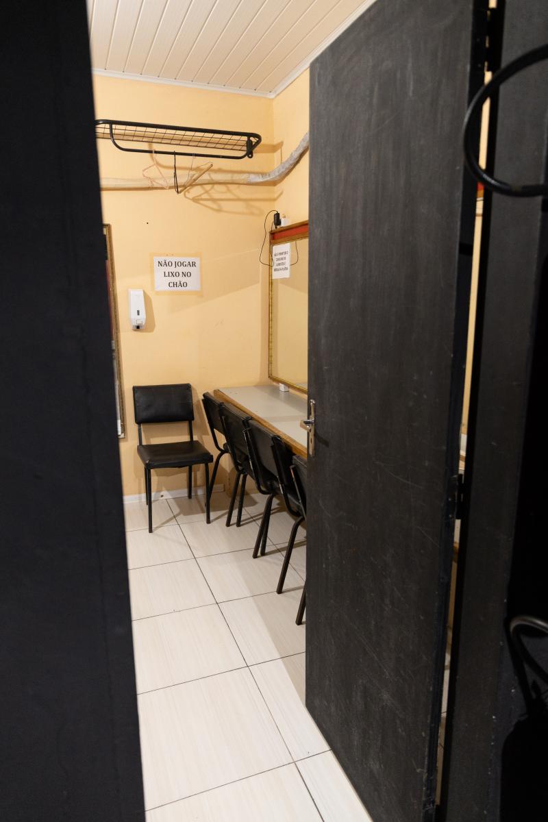 Camarim 1 (fundo do palco) - 2.20m x 2.75m. Bancada, cadeiras, espelho, fita de LED, pia para lavar as mãos e 01 baú.