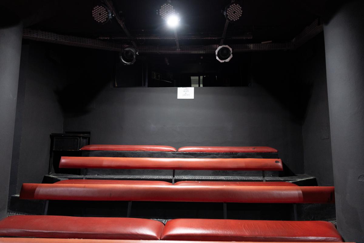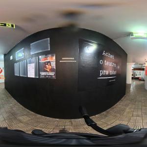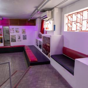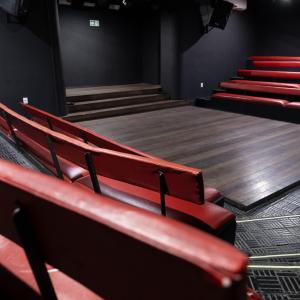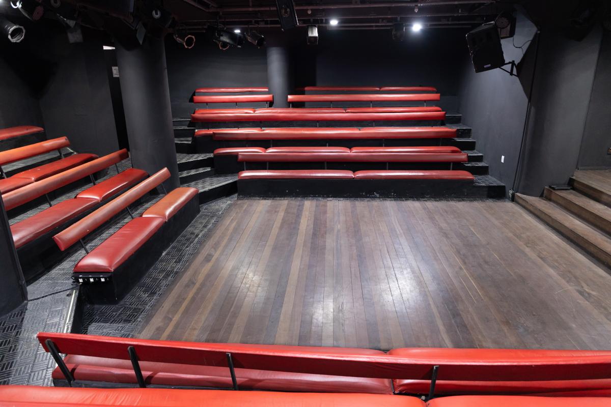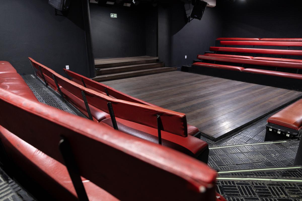 Camarim 1 (fundo do palco) - 2.20m x 2.75m. Bancada, cadeiras, espelho, fita de LED, pia para lavar as mãos e 01 baú.