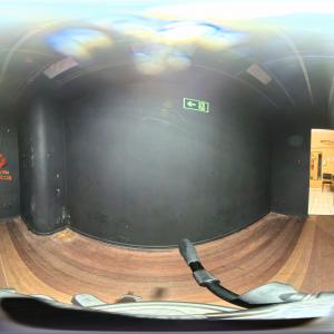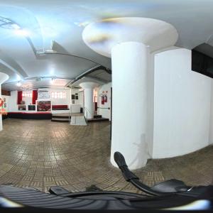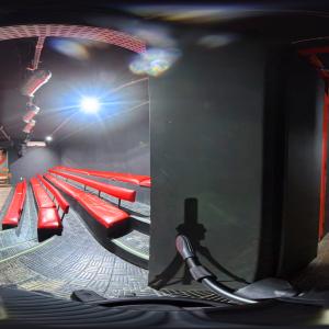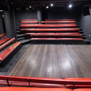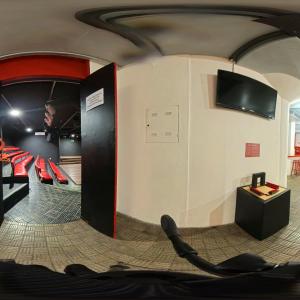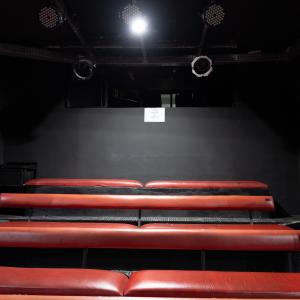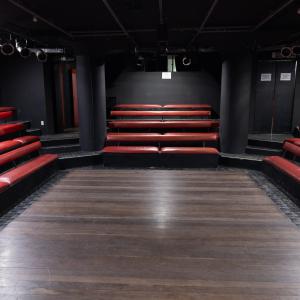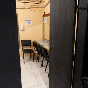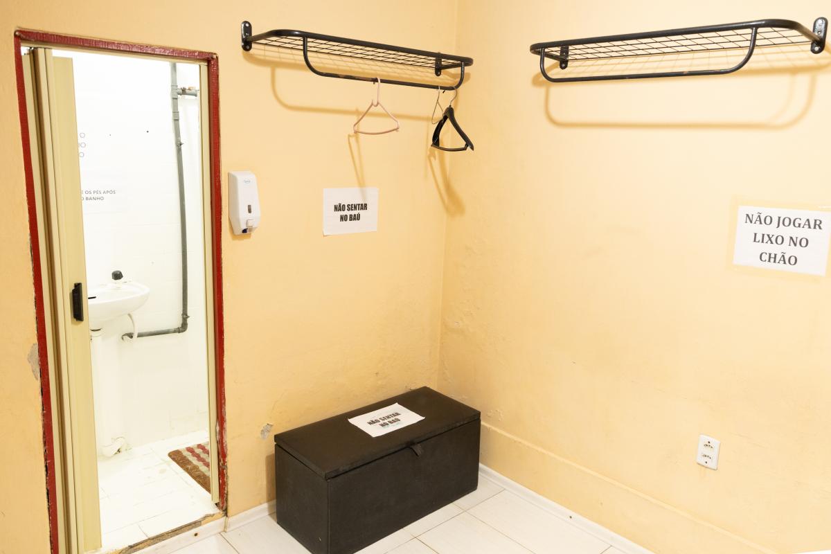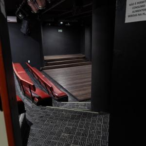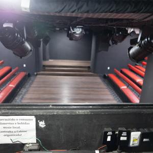 Camarim 2 (camarim lateral próximo à cabine técnica) - 2.20m x 2.80m. Bancada, cadeiras, espelho, fita de LED, banheiro com pia e ducha (0.75m x 1.75m) e 01 baú.