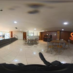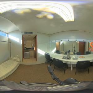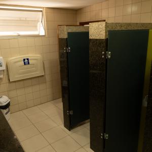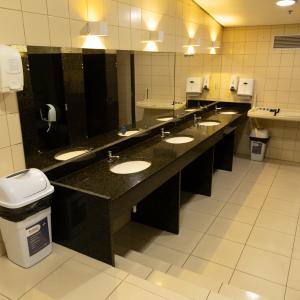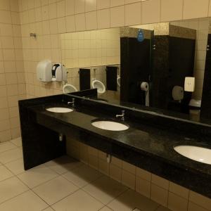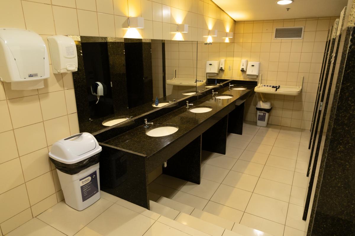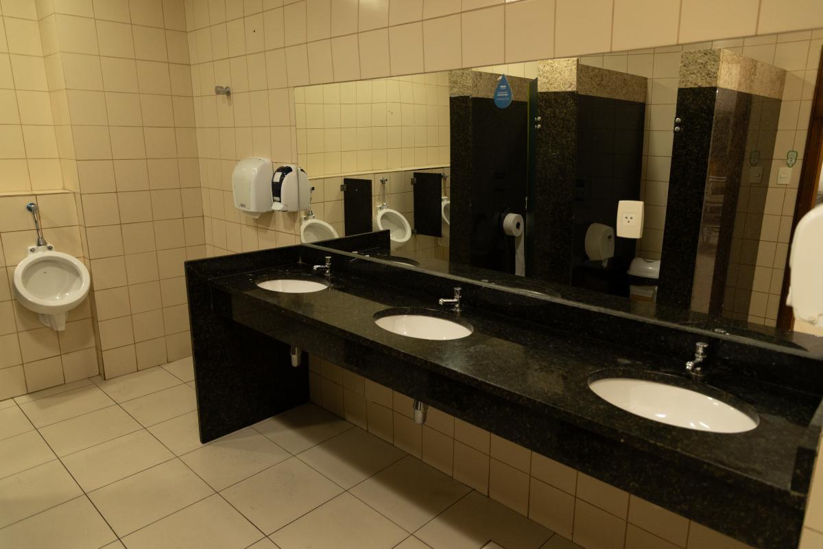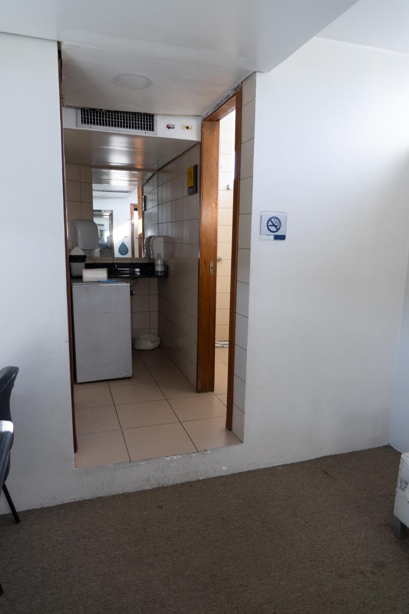 1 bancada com espelho, 1 espelho grande, 4 cadeiras, luzes no espelho, 1 frigobar, 1 chuveiro, ferro de passar, tábua de passar roupa e 1 sofá.