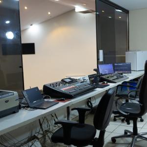 1 mesa Behringer X32; 3 microfones sem fio; 3 microfones com fio; 6 microfones de coral; kit com 8 microfones de bateria e percussão