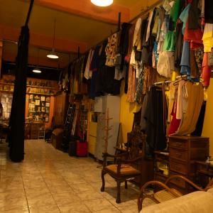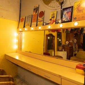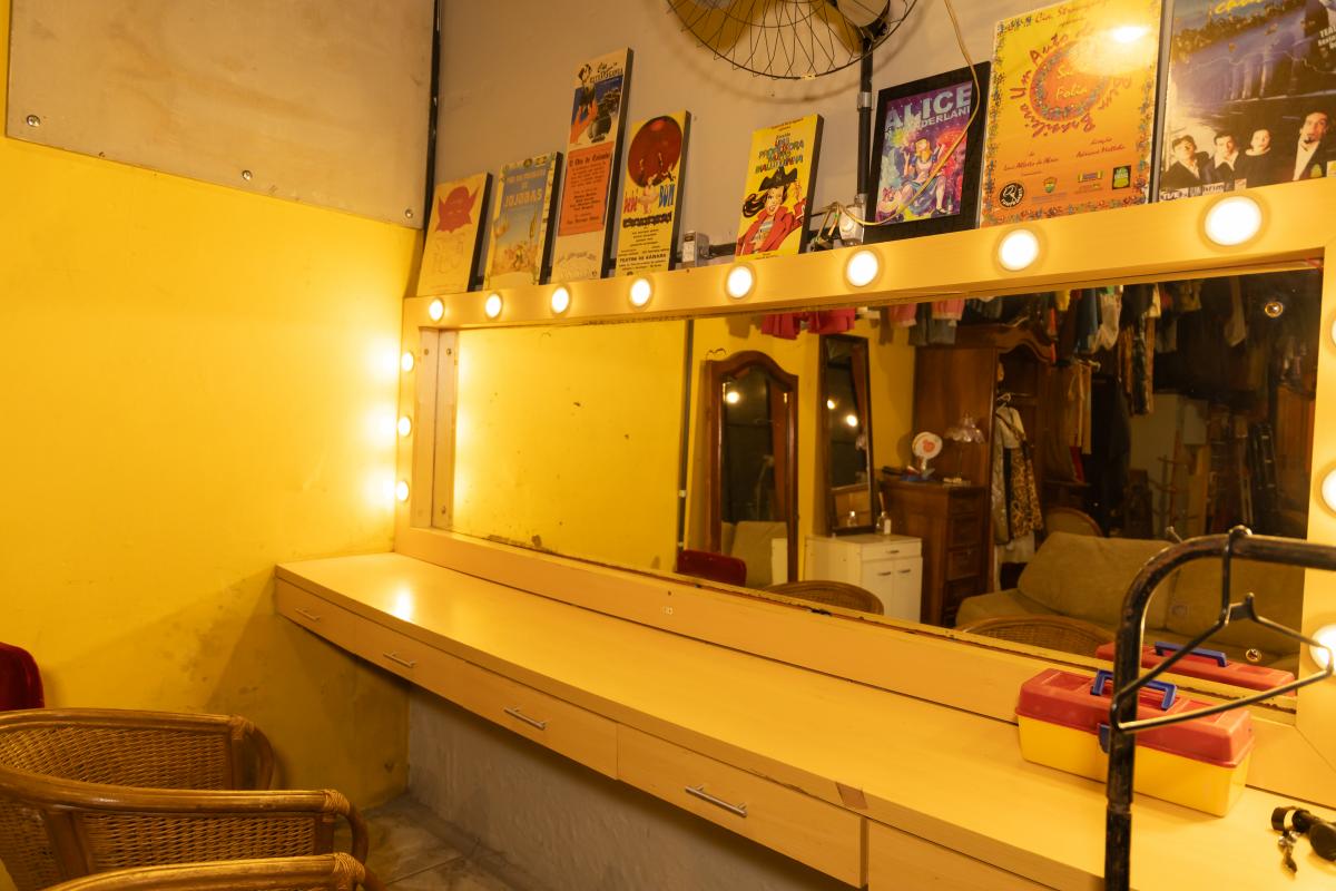 Espaço adaptado, reservado, com espelho e bancada de aproximadamente 3 metros, cadeiras, araras, sofá.