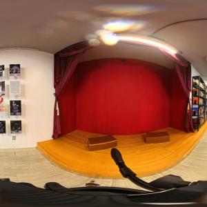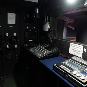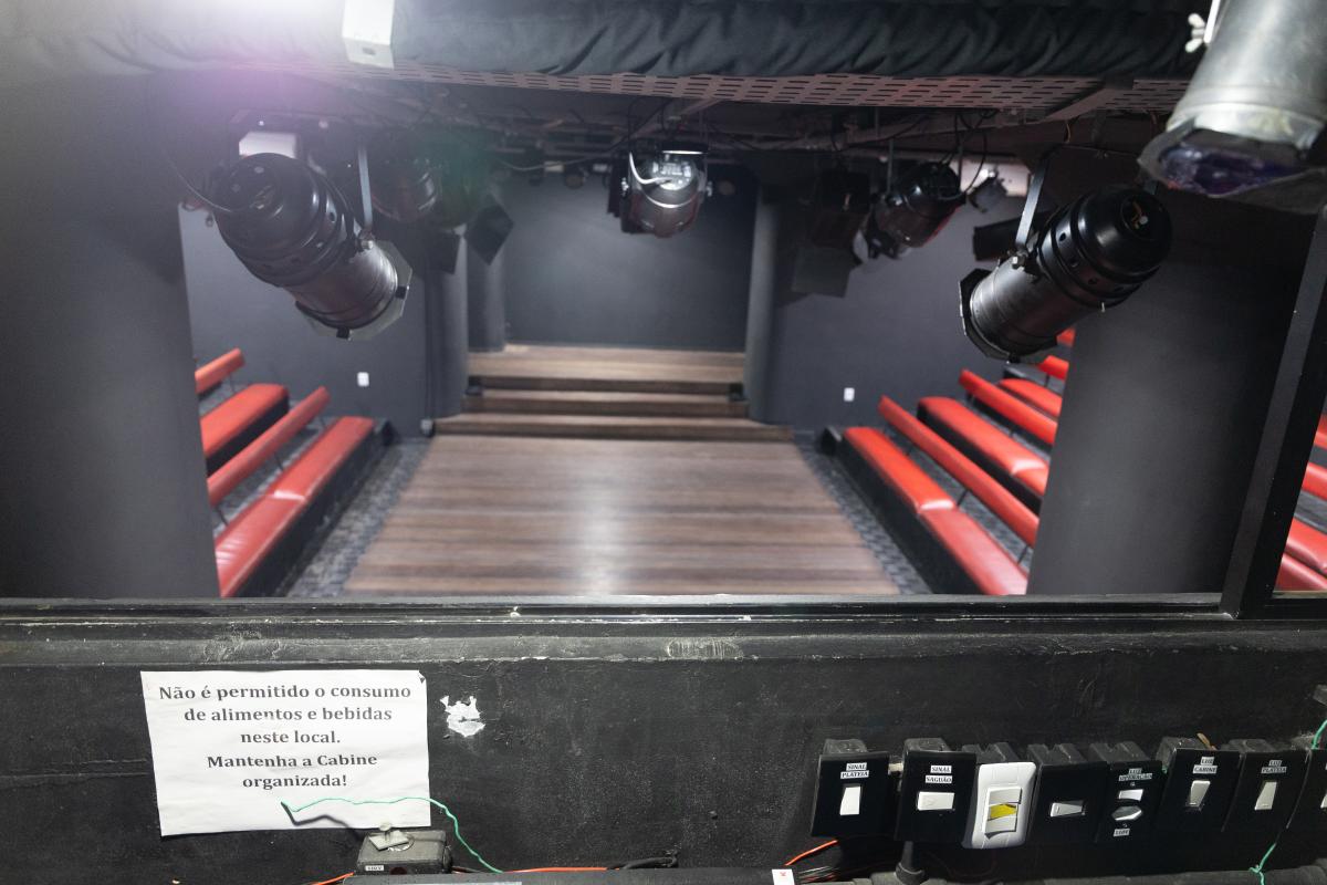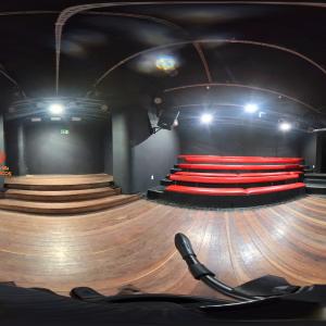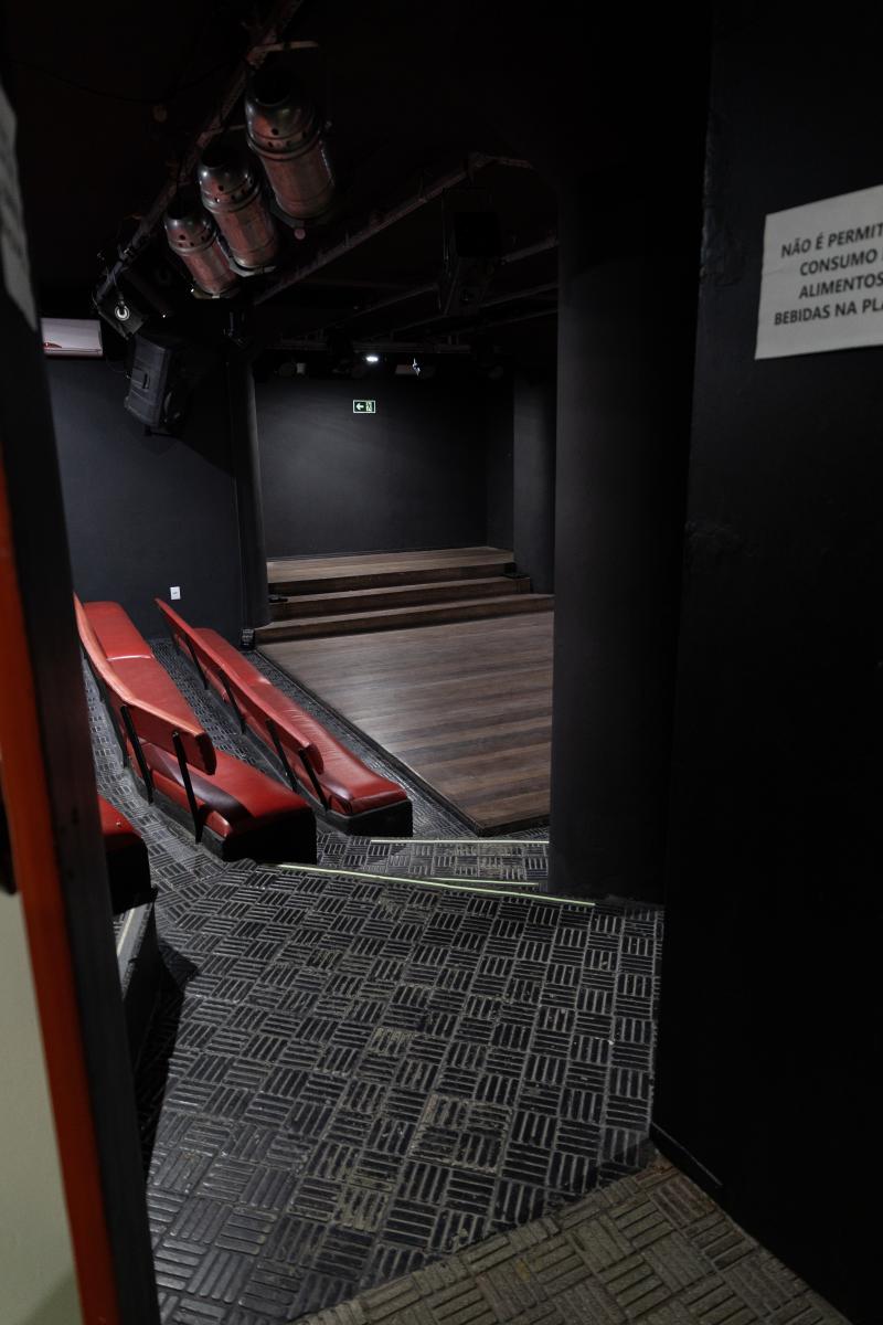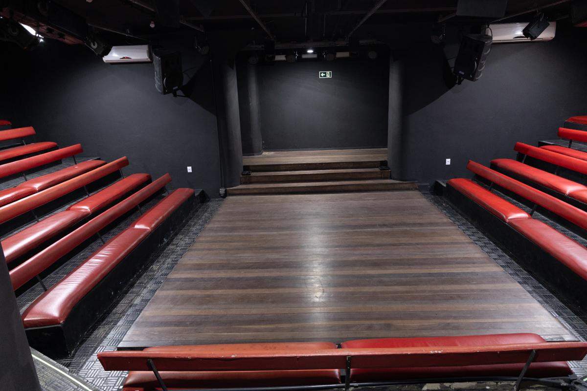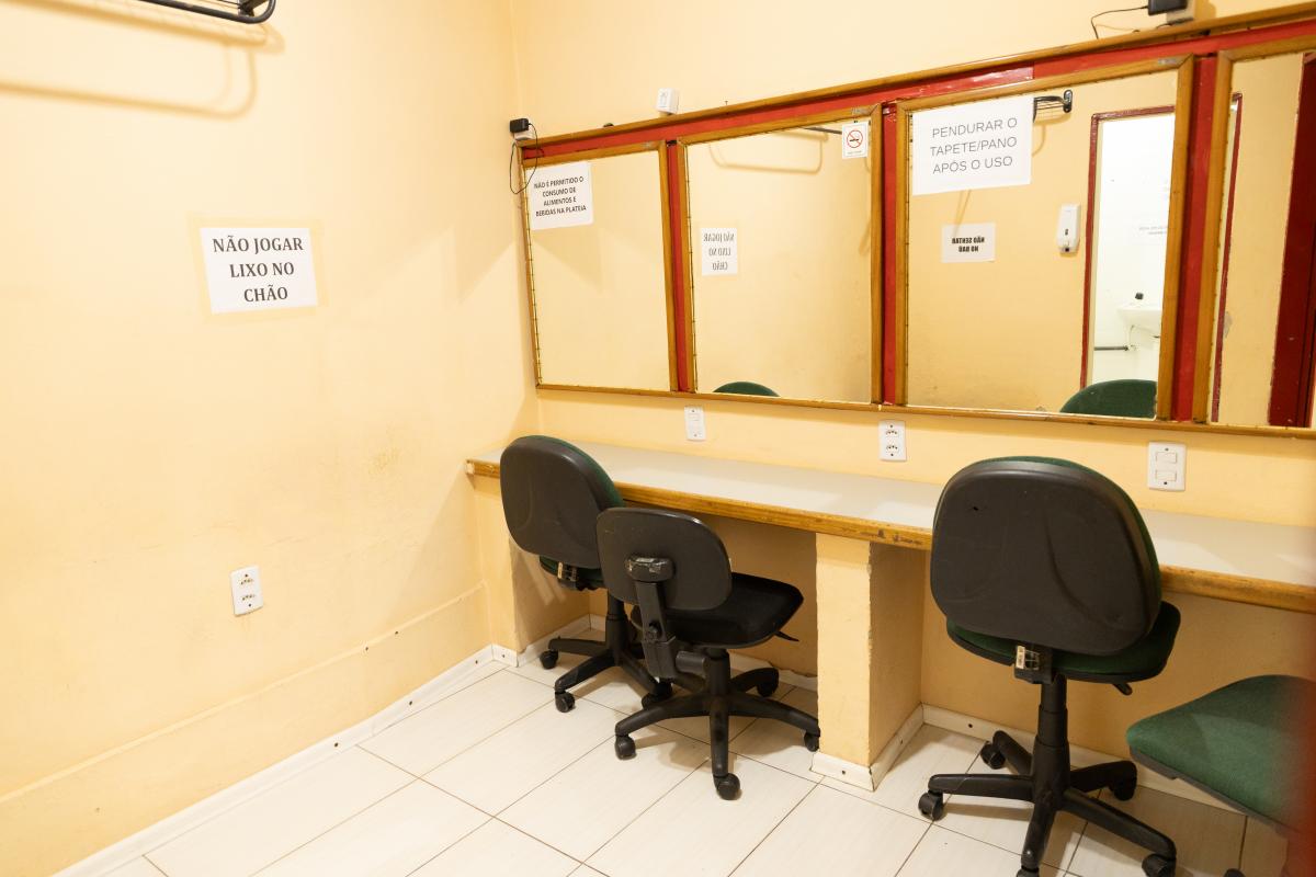 Camarim 1 (fundo do palco) - 2.20m x 2.75m. Bancada, cadeiras, espelho, fita de LED, pia para lavar as mãos e 01 baú.