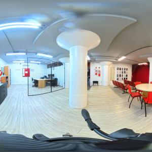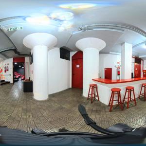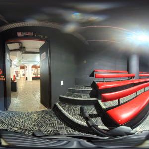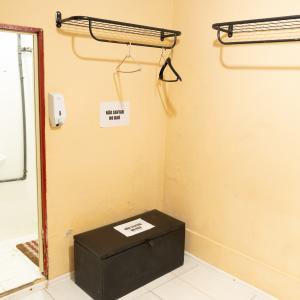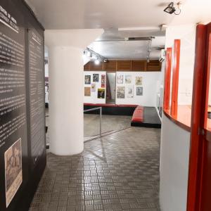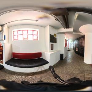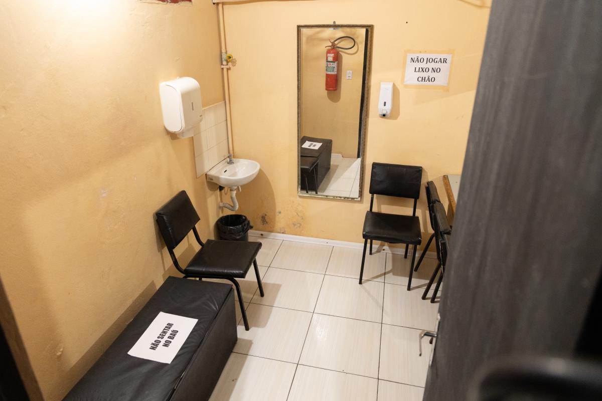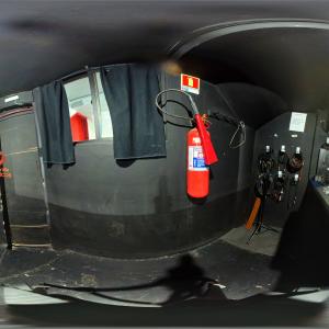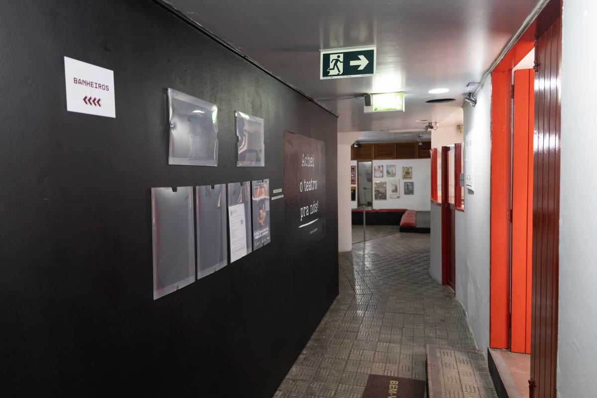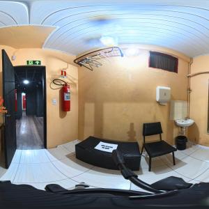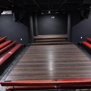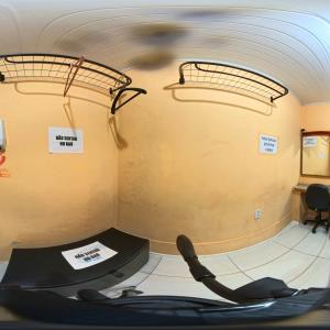 Camarim 2 (camarim lateral próximo à cabine técnica) - 2.20m x 2.80m. Bancada, cadeiras, espelho, fita de LED, banheiro com pia e ducha (0.75m x 1.75m) e 01 baú.