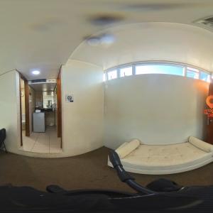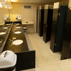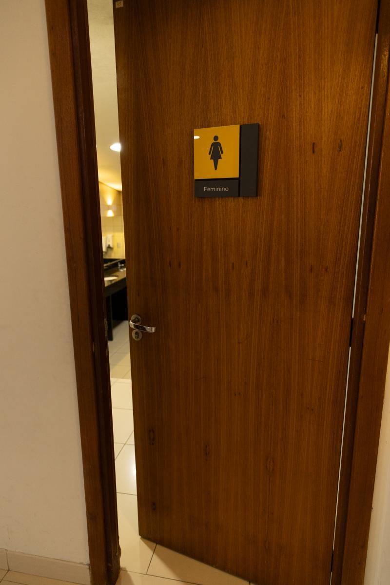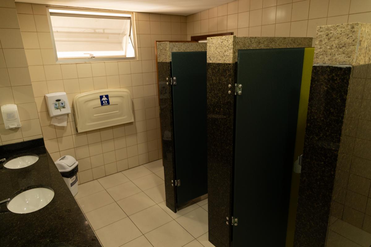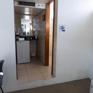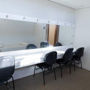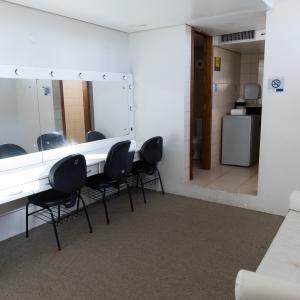 1 bancada com espelho, 1 espelho grande, 4 cadeiras, luzes no espelho, 1 frigobar, 1 chuveiro, ferro de passar, tábua de passar roupa e 1 sofá.