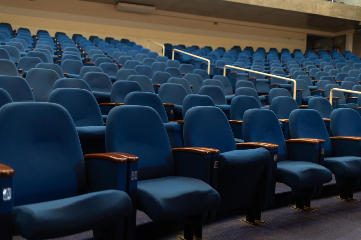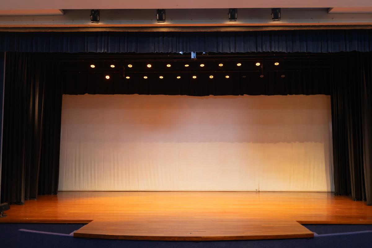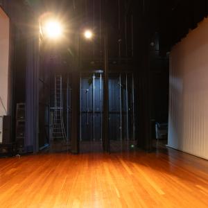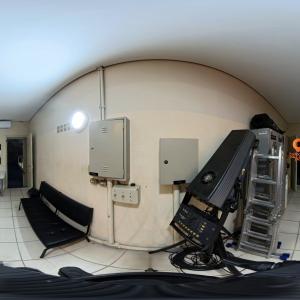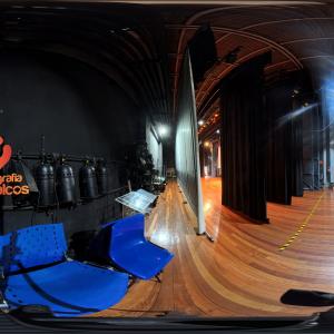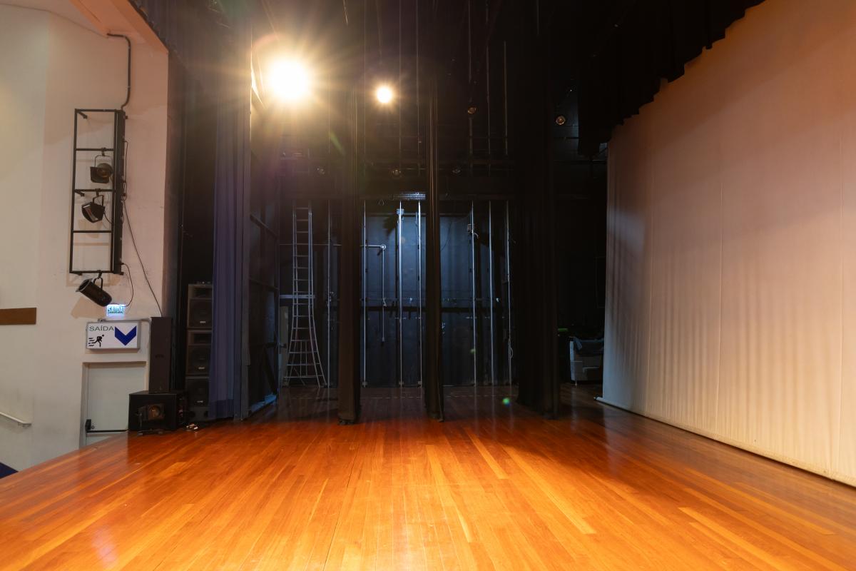 8 varas de cenário contrapesadas; possuem "pernas", rotunda e bambolinas, todas móveis.