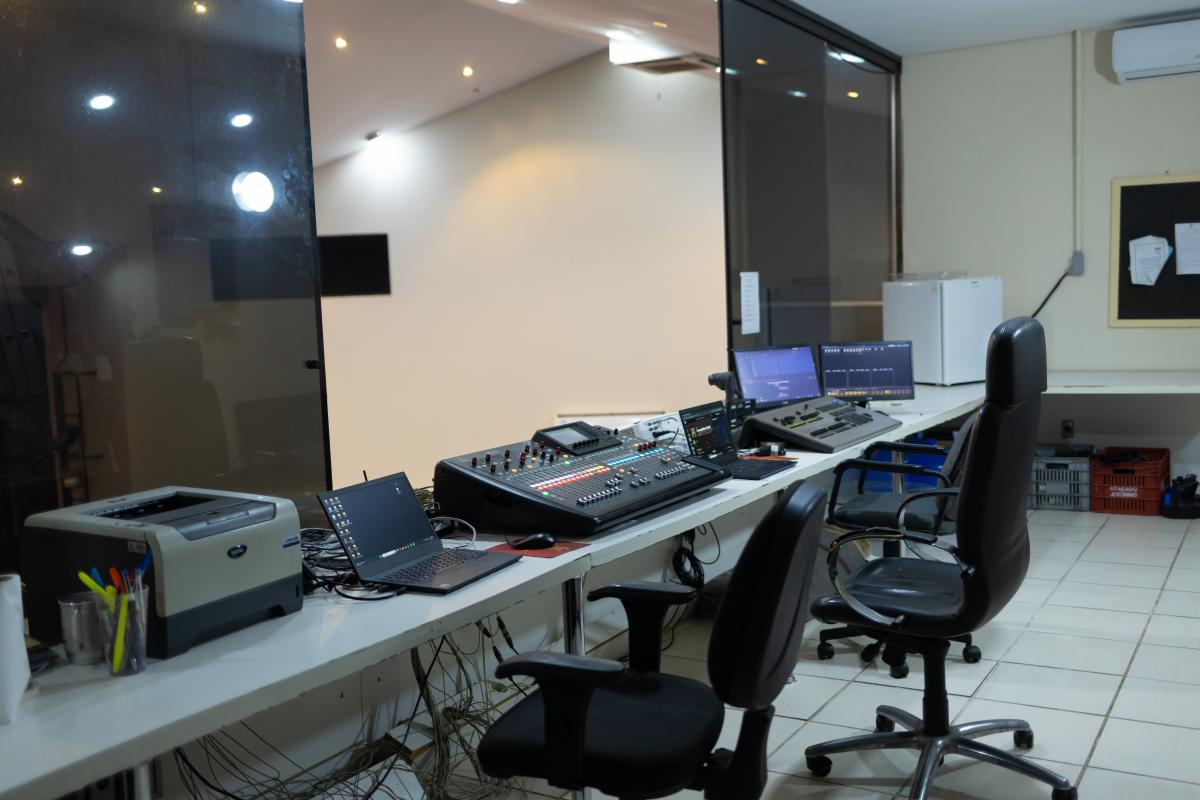 1 mesa Behringer X32; 3 microfones sem fio; 3 microfones com fio; 6 microfones de coral; kit com 8 microfones de bateria e percussão