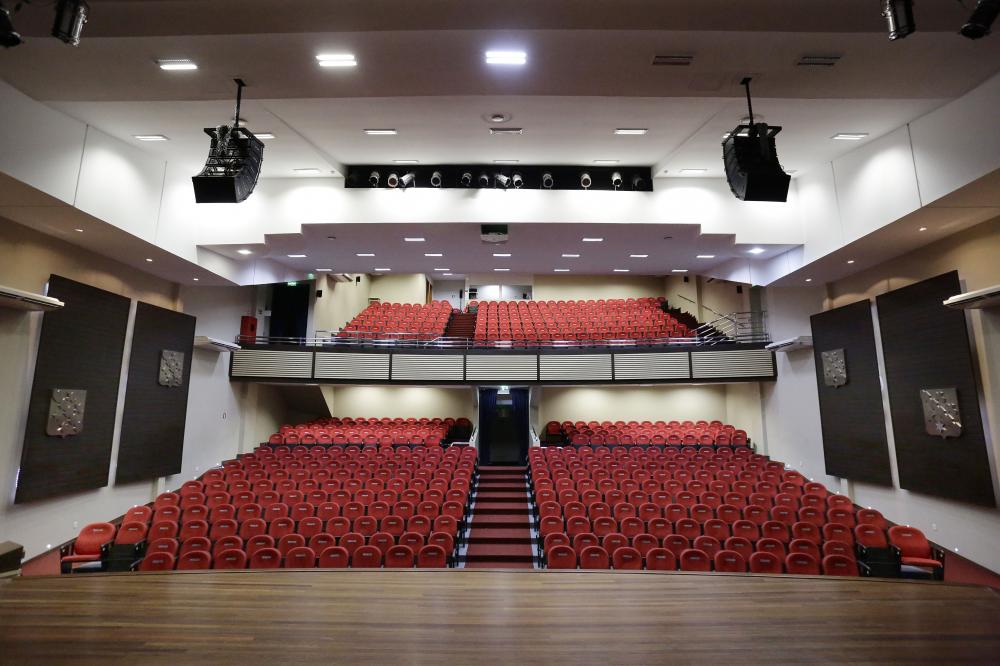 As caixas acústicas estão localizadas na parte inferior e superior do Teatro (L+R) sendo a parte inferior composta por sub graves de operação entre 30 hz e 120 hz e média-altas entre 120 hz e 20 Khz (caixas de som marca Oneal EVO Line Array (média-altas) DB tecnologia acústica modelo Scoop Compatc 15 (sub graves) e amplificadores marca Machine PLS6400 para os sub-graves).